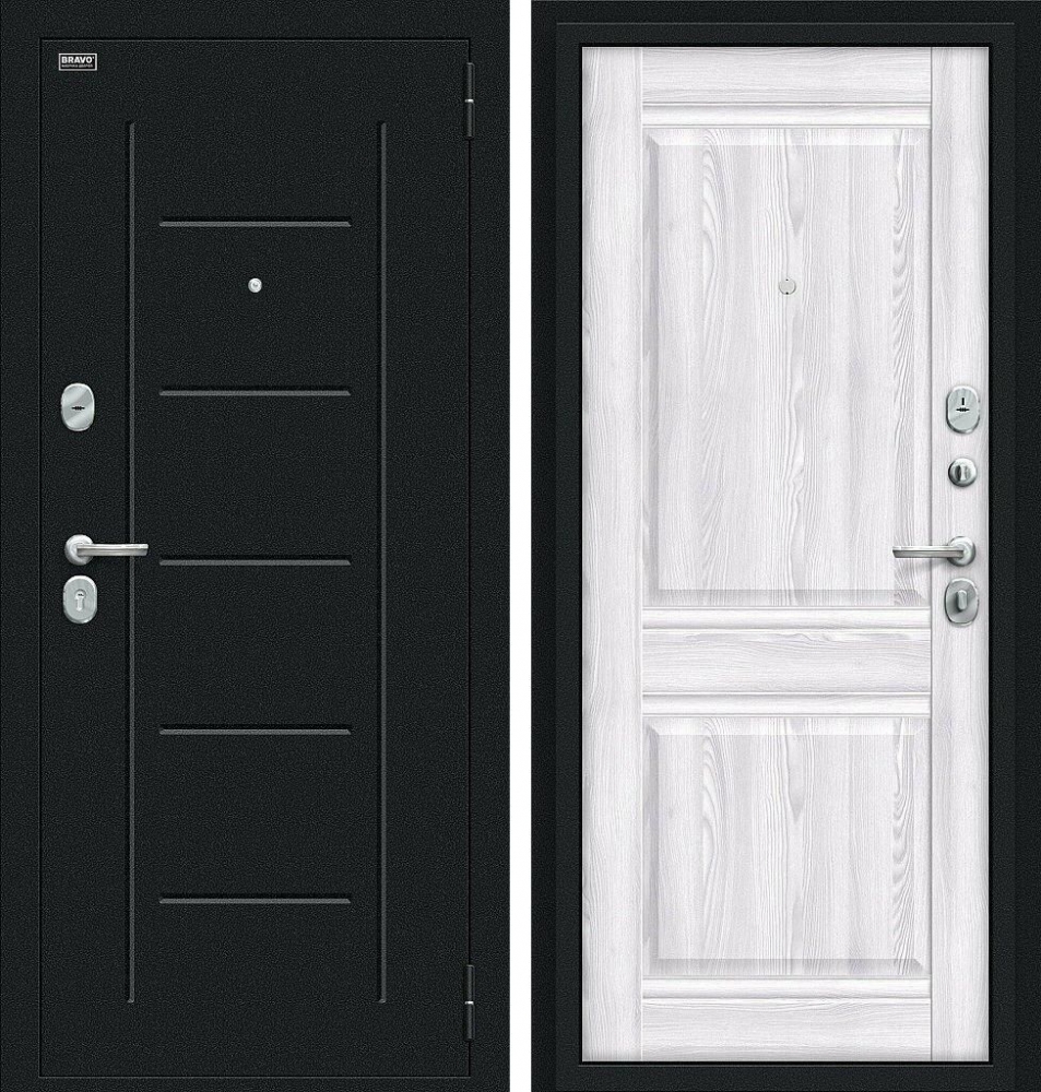 Семь усиливающих уголков и защитный карман для замков. Дополнительную стойкость ко взлому обеспечивают два противосъемных штыря.